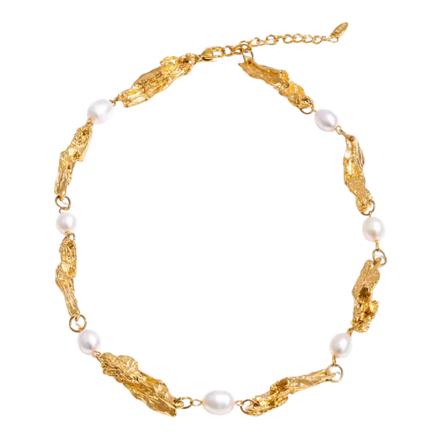 Featuring sculptured gold detailing paired with luminous pearls, this piece is designed to sit beautifully along the collarbone catching the light with every movement.